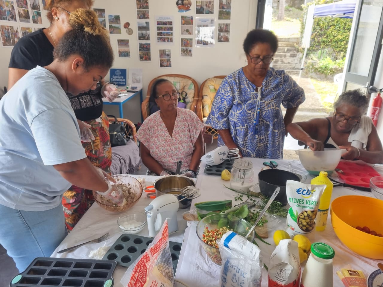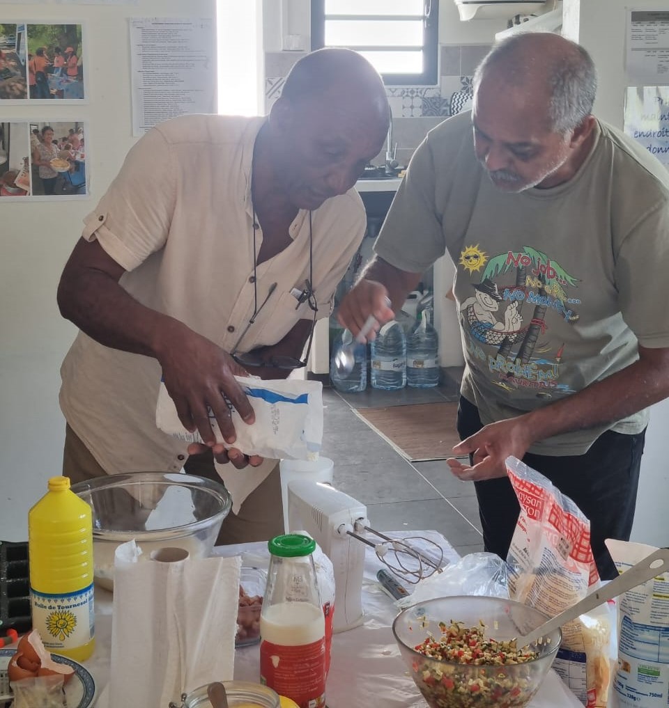 Après le repas, les seniors ont profité d’un moment ludique autour de jeux traditionnels (dominos, sirandanes ou "devinettes créoles"). Les gourmands étaient conviés à un nouvel atelier « Cuisine & Santé » pour découvrir des recettes festives, saines et économiques. Béatrice, l’animatrice, a focalisé cette fois sur le salé, et la table de Noël : les dix participants ont préparé, entre autres, des rillettes aux sardines aromatisées aux herbes aromatiques du jardin, et des cakes salés qui « recyclaient » l’huile des boîtes (de sardines) et les tomates cerise ayant décoré les plats de midi. « Je ne jette rien – tout est récupérable ! » affirme Béatrice qui a à coeur de préserver la planète aussi bien que la santé et le porte-monnaie.