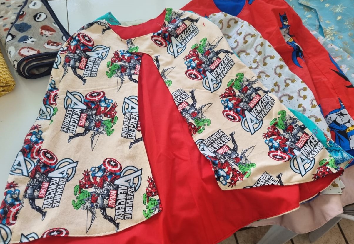 Avec le soutien de Géraldine, infirmière et bénévole de l’association Les P’tits Doudous, nos couturières au grand coeur ont confectionné, pendant plusieurs semaines, de magnifiques capes de super-héros : des créations colorées, douces et faites main, pensées pour les bébés comme pour les plus grands enfants.