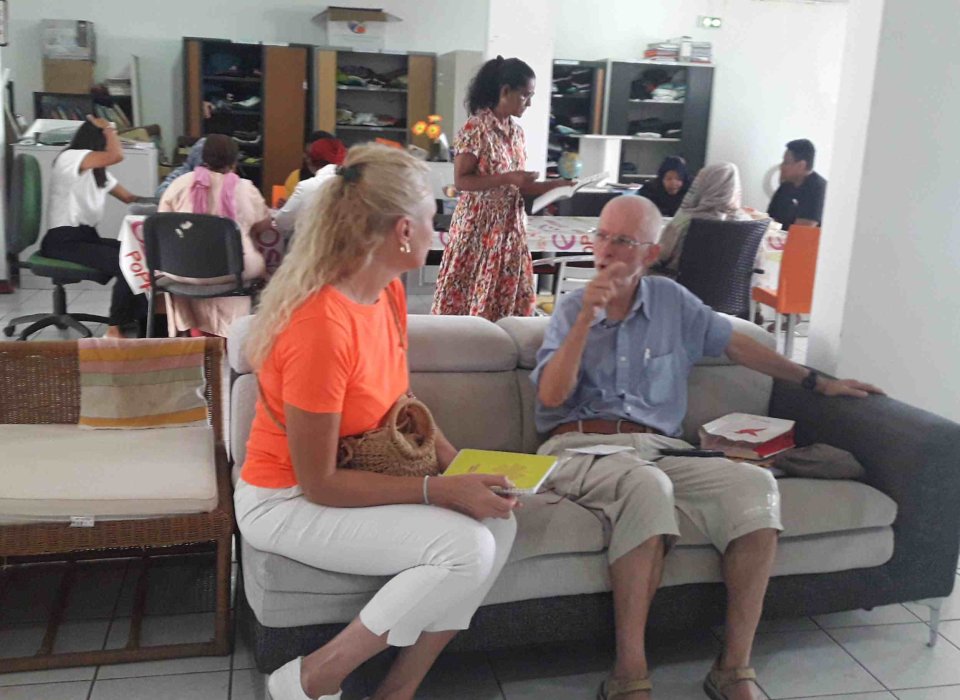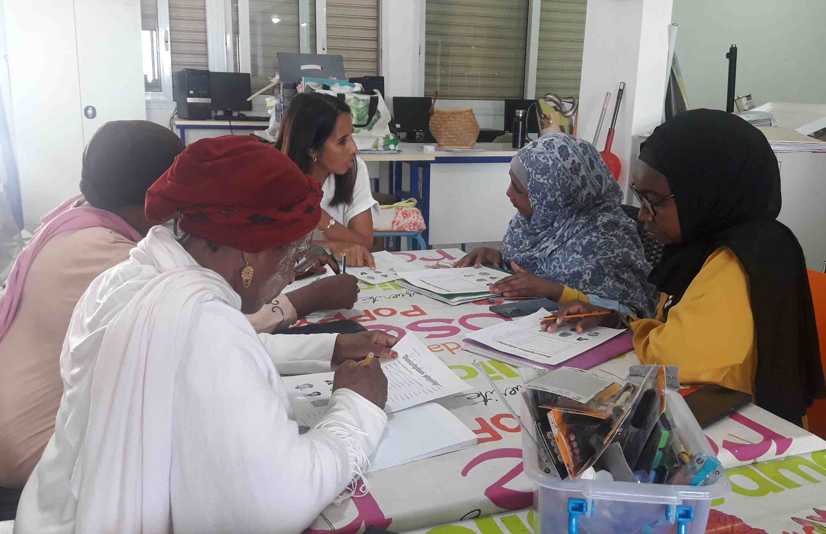 Deux fois par semaine, à la Kaz Fraternelle, des bénévoles accompagnent des personnes étrangères récemment arrivées à La Réunion dans leurs efforts pour apprendre le français. Les cours se déroulent le mardi et le jeudi, en petits groupes, voire en individuel, selon les effectifs. « En moyenne il y a entre 10 et 12 personnes, explique Lucie, l’un des 3 enseignants bénévoles. Nous recevons des Malgaches, des Sri Lankais, des Chinois, des Comoriens, mais aussi d’autres nationalités ». Comme en atteste la présence de Youlya l’Ukrainienne, dont c’est la première séance.