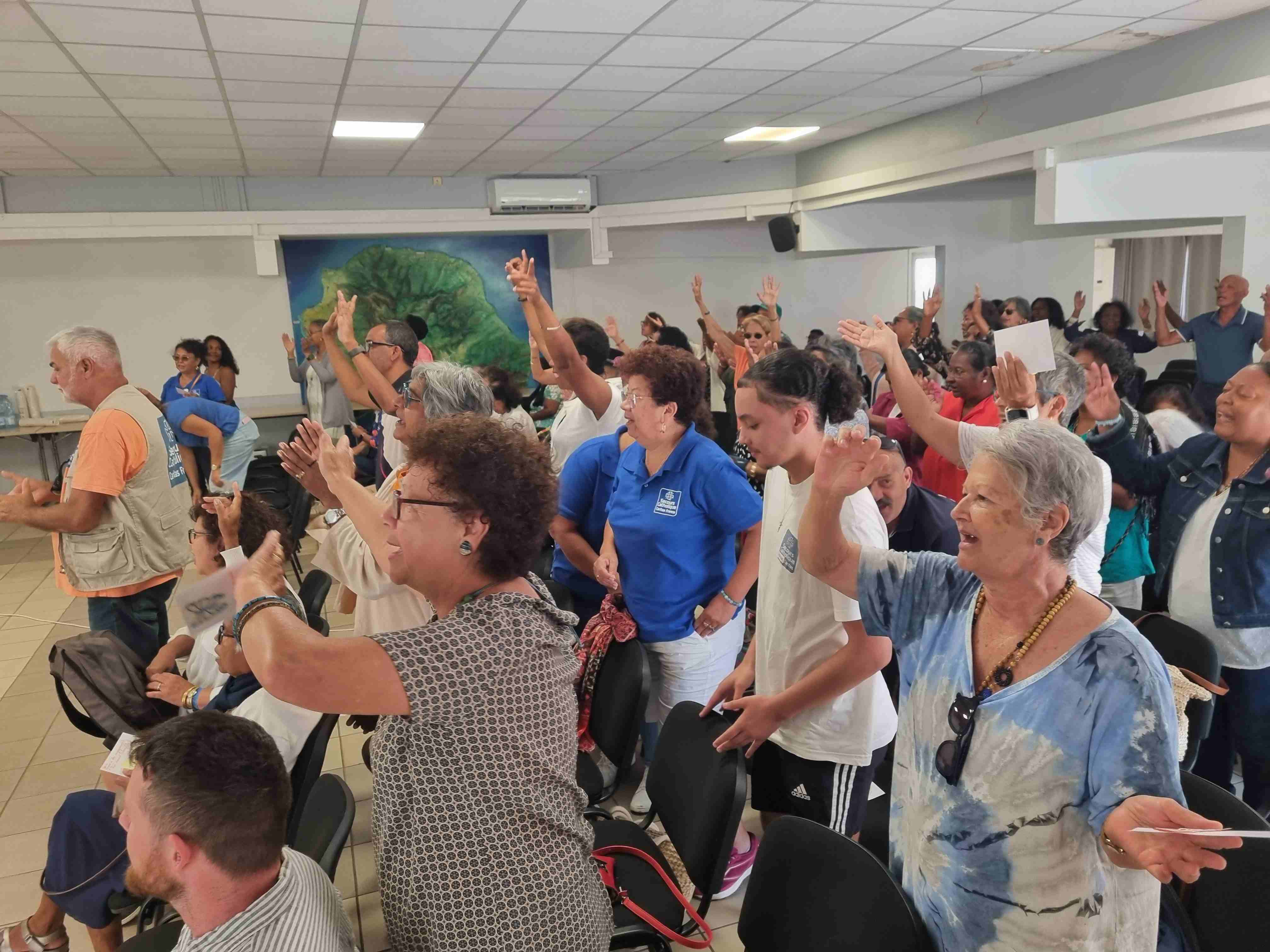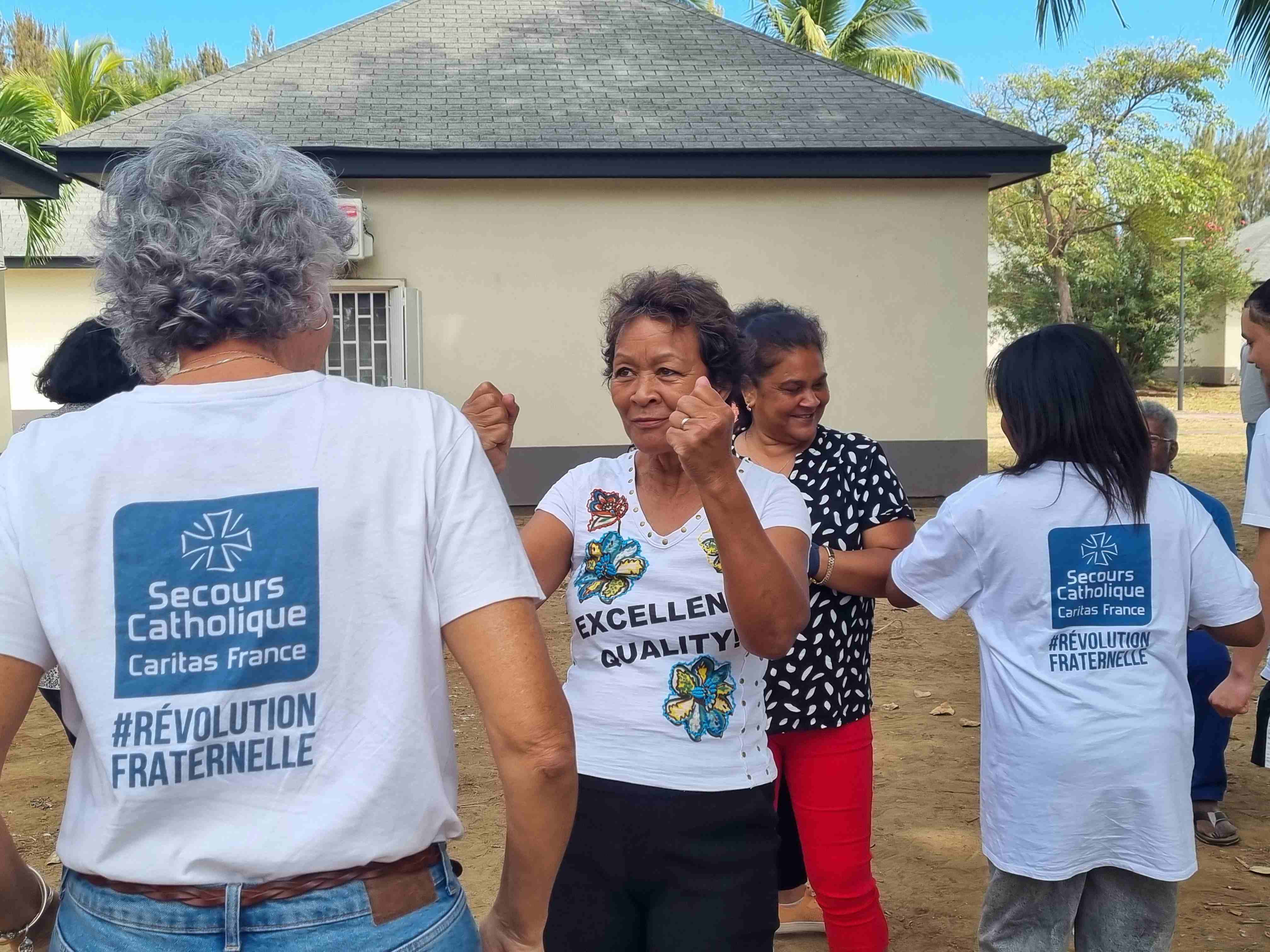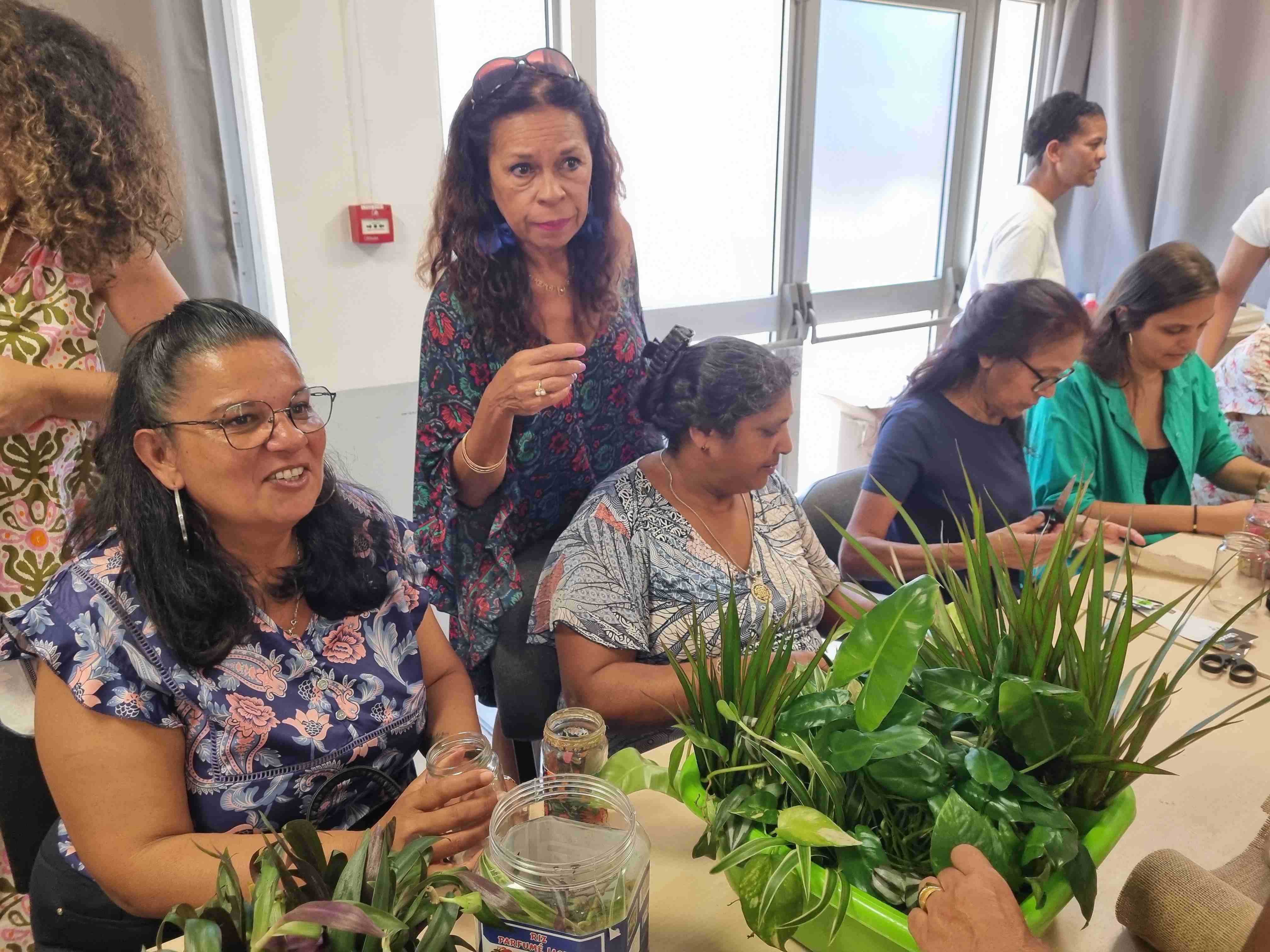 Cette année, la Journée a eu lieu au Village Corail à Saint-Gilles. Dans ce cadre agréable et spacieux, rafraîchi par la petite brise du lagon, de nombreuses activités ludiques ou créatives sont proposées tout au long de la matinée. L’accueil se fait d’abord dehors, autour d’un café ou un thé, et ensuite dans la grande salle où l’équipe organisatrice lance le dynamisme et présente les activités de la journée : il y en a pour tous les goûts. Les bénévoles se répartissent au gré de leurs envies, et les équipes des différents secteurs se mélangent. A l’intérieur: dominos pour les uns, coloriage de mantras ou créations de décorations florales pour les autres… « C’est pour offrir à ma petite Vierge », annonce Judith (Ravine des Cabris), toute heureuse de sa création. Dehors, sous les filaos, d’autres découvrent la sophrologie, font du théâtre ou de l’improvisation, ou jouent à la pétanque.